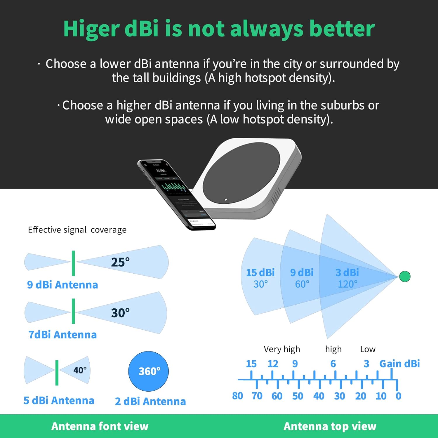 - Valley floors near hills — nodes above you sit outside the flat beam. Use 2–3 dBi here.